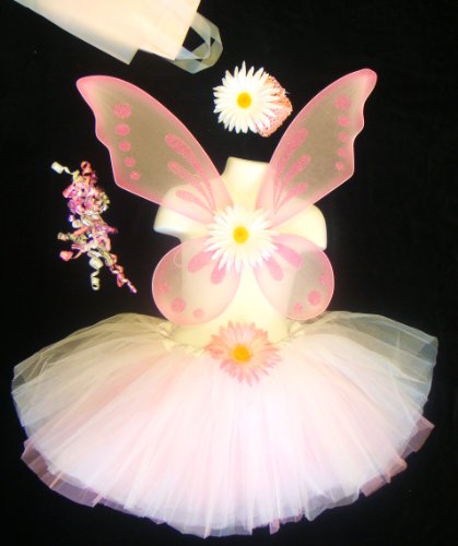 Girls Pink and White Fairy Pixie Costume Set. Includeds 2 Tutus Flower Pixie Wings and Flower Crochet Headband Review